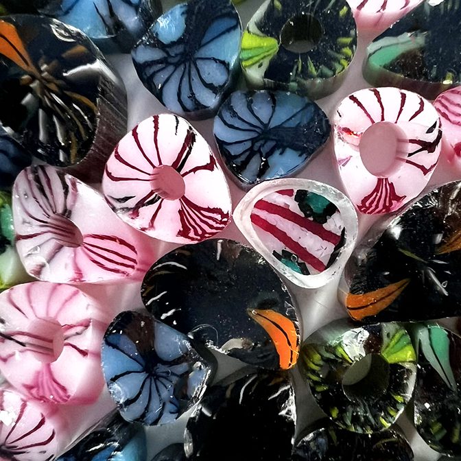 The best part? You can buy these curious murrine at a budget-friendly price - all sourced from the end of the pull when patterns may start to fade or the cane becomes hollow, as well as from the beginning of the pull when only a portion of the pattern is visible.