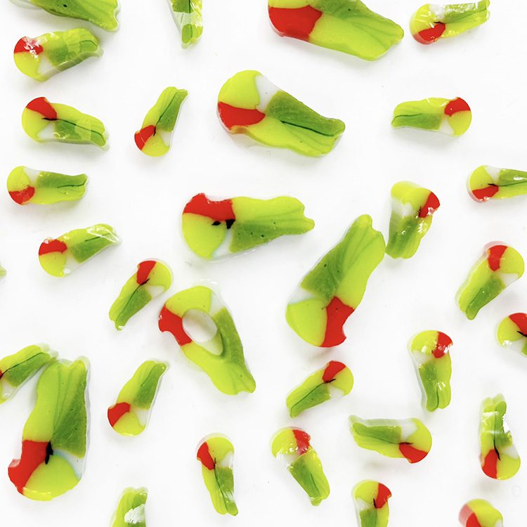 Curious – Mixed Size – Parakeet Murrine. All made with 100% Bullseye Glass 90COE. They can be purchased in 25g bags.