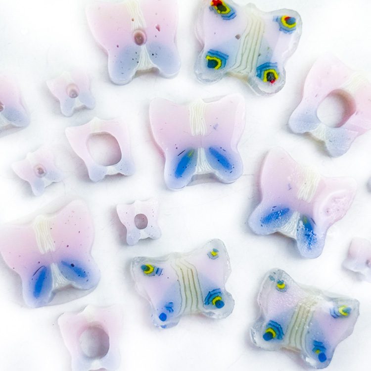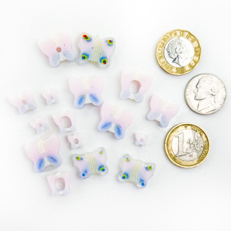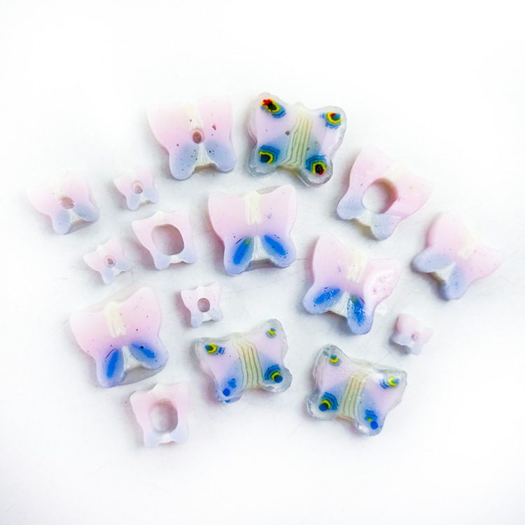 Curious – Mixed Size – Pink Purple Butterflies Murrine. All made with 100% Bullseye Glass 90COE. They can be purchased in 25g bags.