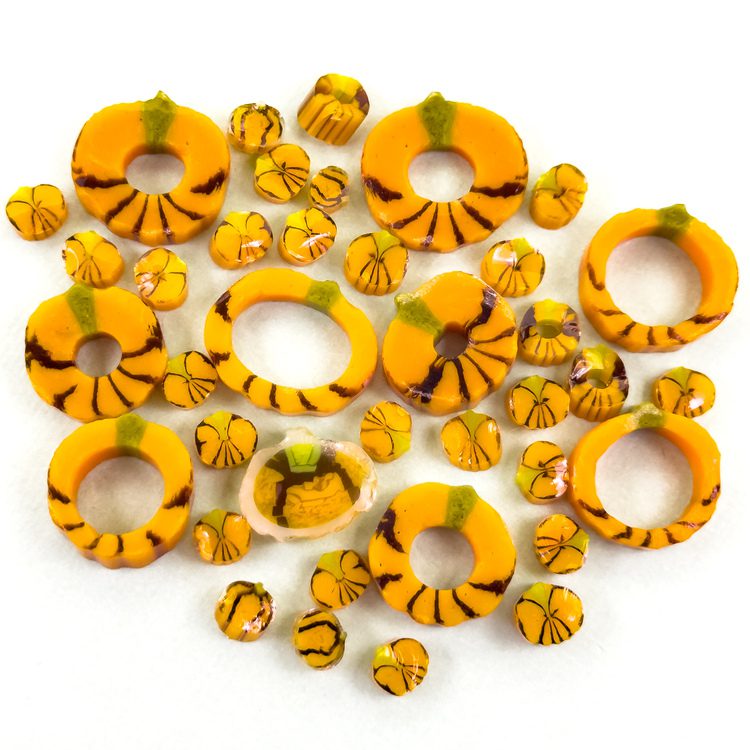Curious – Pumpkin Murrine – All made with 100% Bullseye Glass 90COE. They can be purchased in 25g bags.