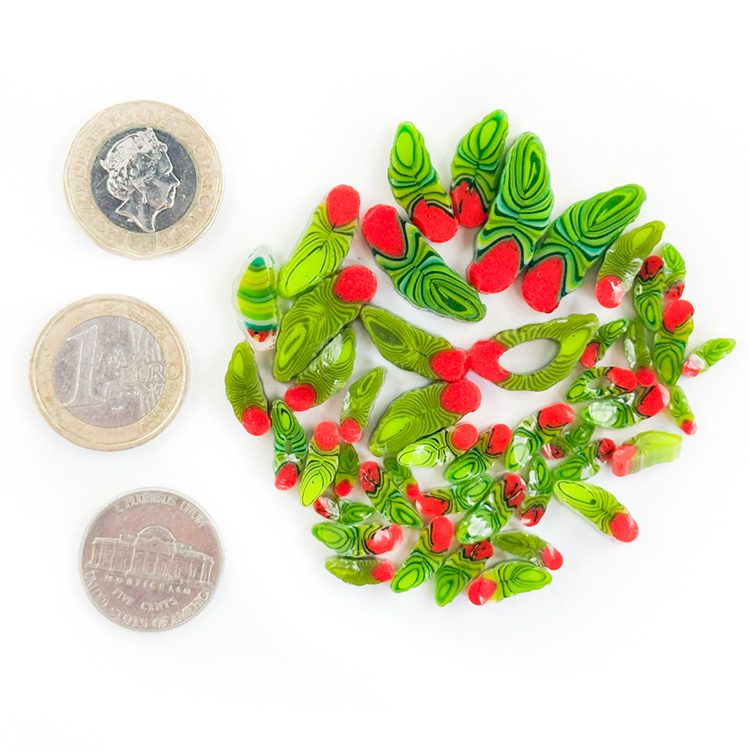 Curious – Red and Green Petals. All made with 100% Bullseye Glass 90COE. They can be purchased in 25g bags.
