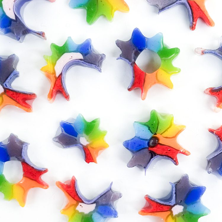 Curious XL – Rainbow Sunflower. All made with Oceanside Glass 96COE. They can be purchased in 25g bags.