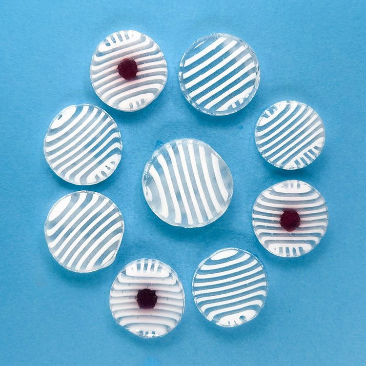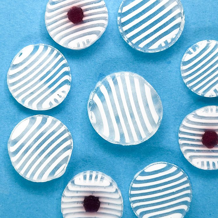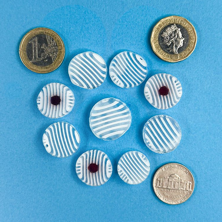 Curious XL White and Clear Stripe Murrine – 25g – All made with 100% Bullseye Glass 90COE. They can be purchased in 25g bags.