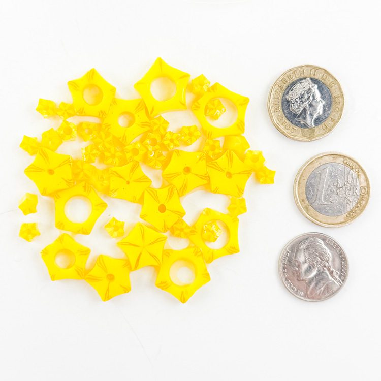 Curious – Mixed Size – Yellow Star with hollows. All made with Oceanside Glass 96COE. They can be purchased in 25g bags.