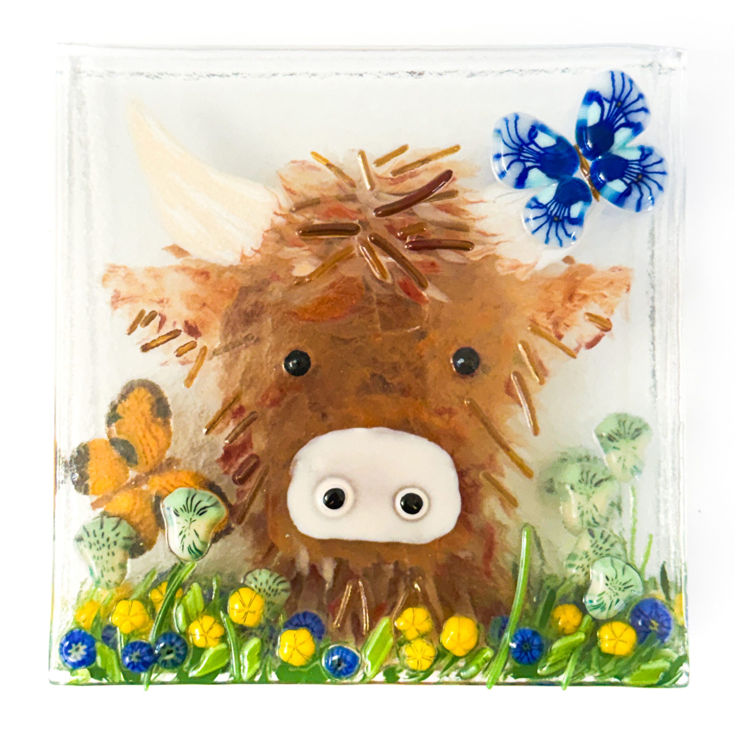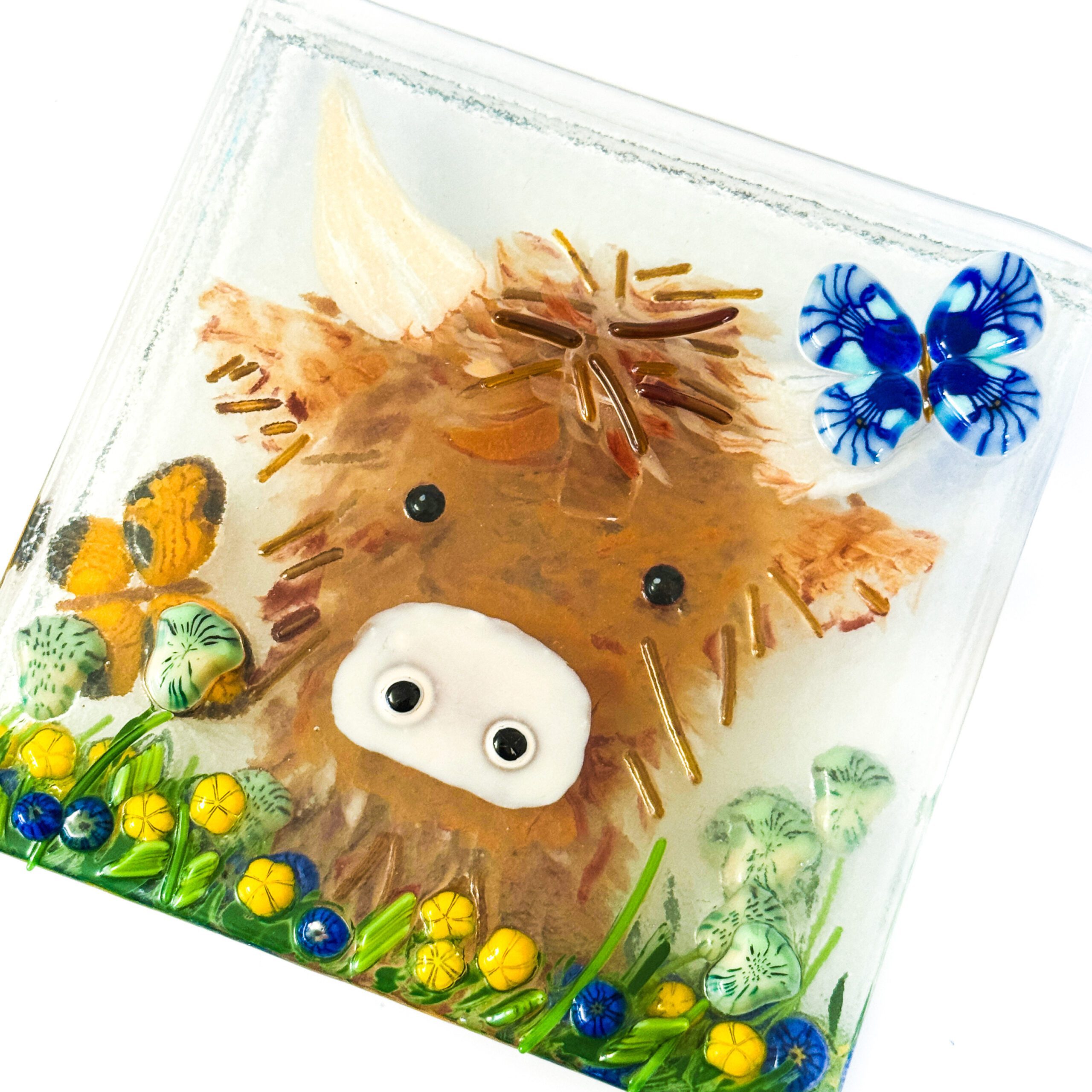 A handcrafted fused glass 3D artwork featuring a charming Highland cow.