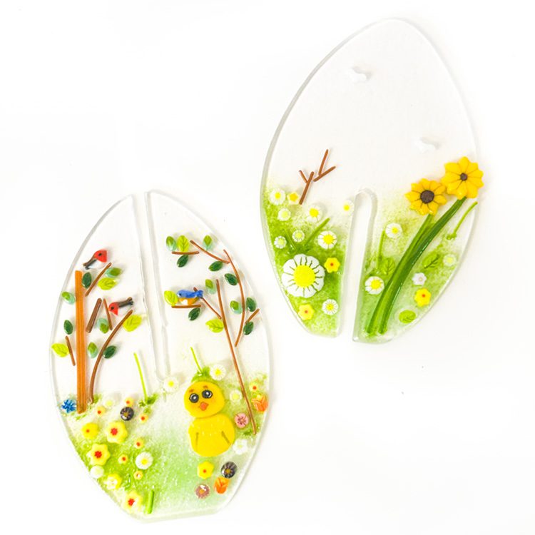 A delicate fused glass egg featuring a charming spring scene.