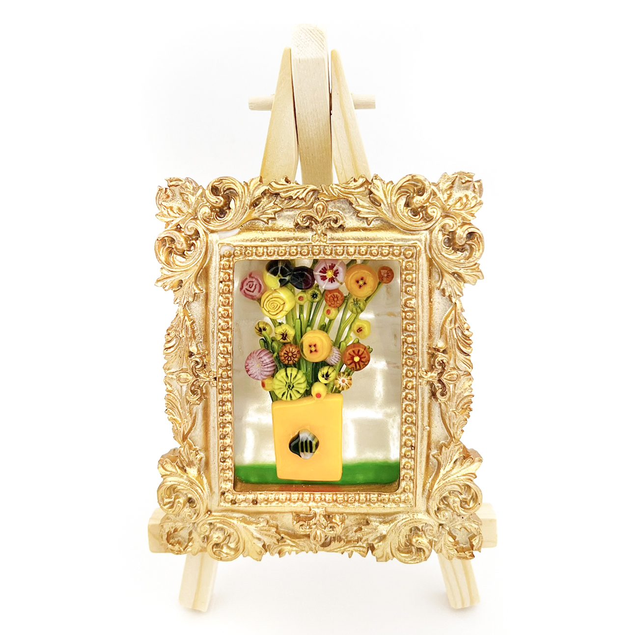 Fused Glass Flower bouquet in the gold frame is a very cute home decoration that will stand out in every home. With the frame you will receive a small wooden easel for a lovely display of frames.