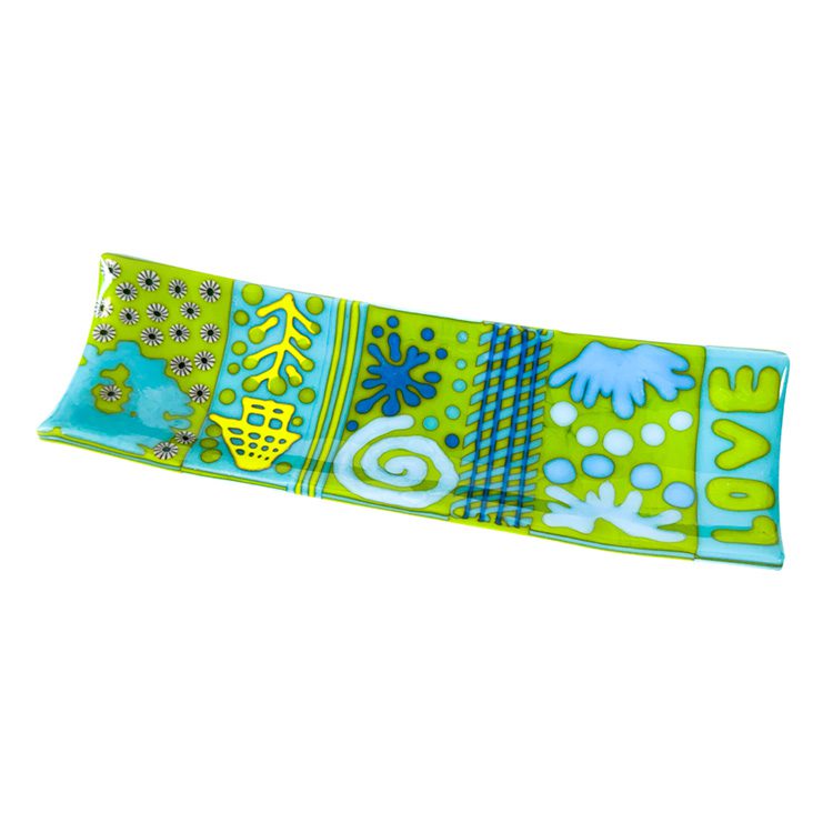Handcrafted glass tray with green and blue patterns and ‘Love’, perfect for decor.