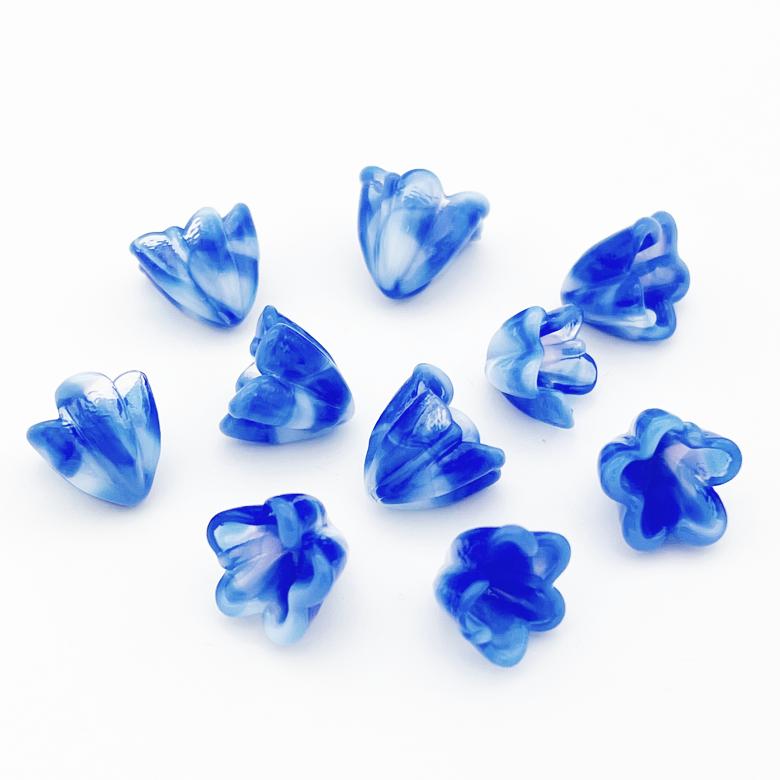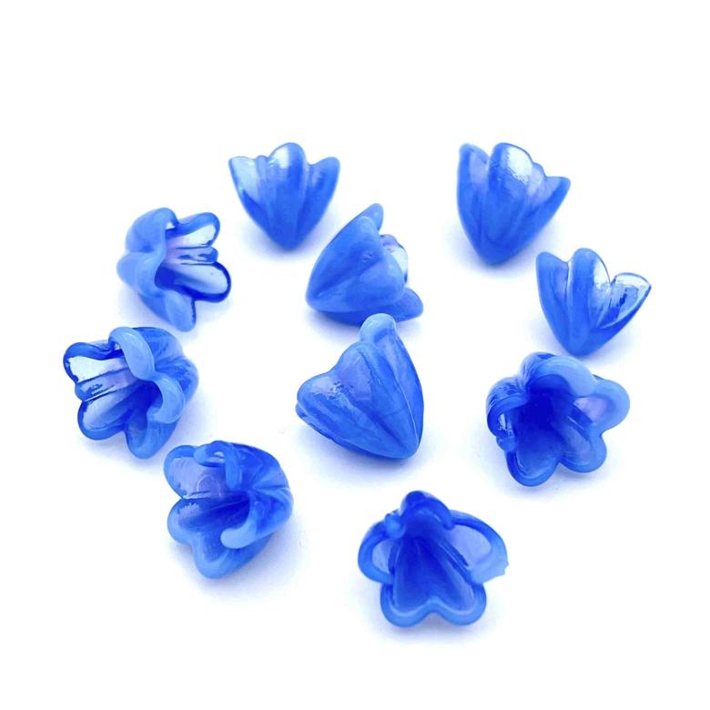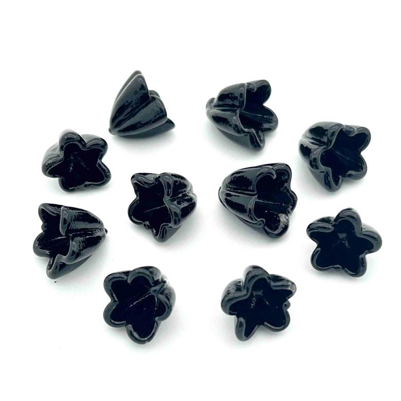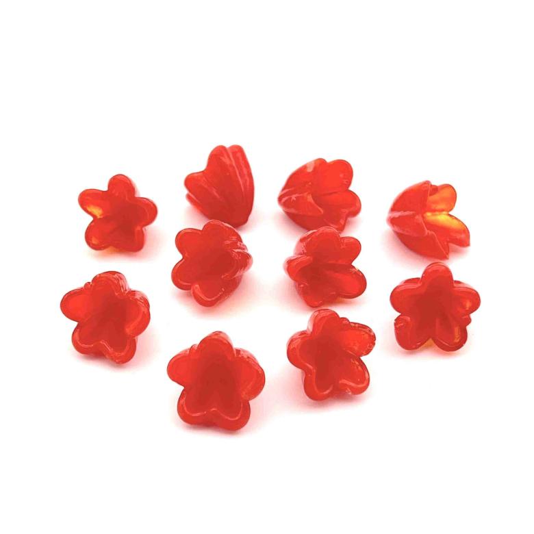 Our medium-sized flowers measure around 15mm. They’re priced similarly to the small variants, because production time influences cost more than glass quantity. Remember, some striking glass colors might evolve during flamework and further alter upon tack fusing.
