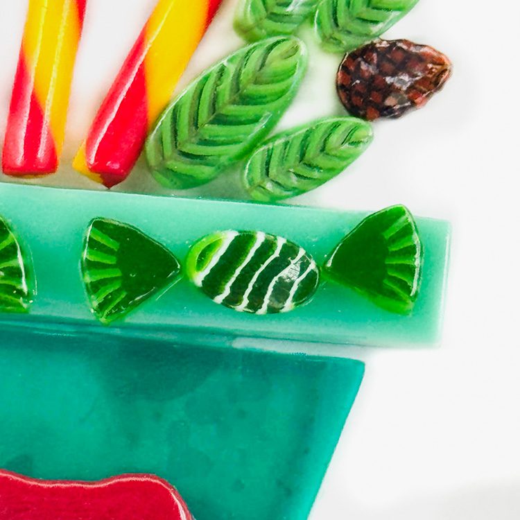At Tabitha’s Glass Emporium, we proudly offer our designer murrine collection, while showcasing intricate patterns reminiscent of millefiori. Bring festive cheer to your creations with the sweet Green Candy murrine, perfect for adding a playful touch to your Christmas project!