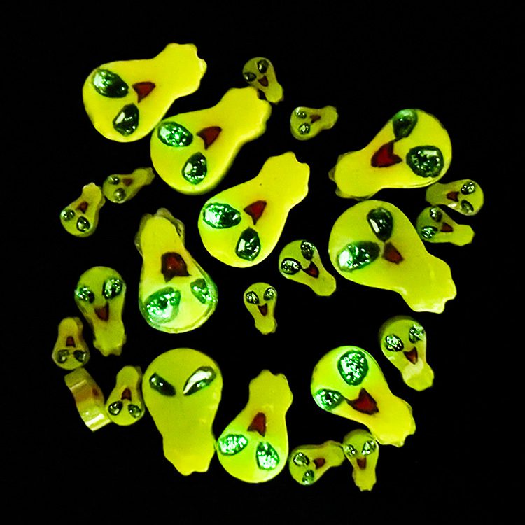 Murrine – Mix Size – Green Alien – 96COE – stunning celestial designs, some glow-in-the-dark! Made from Oceanside Glass 96COE.