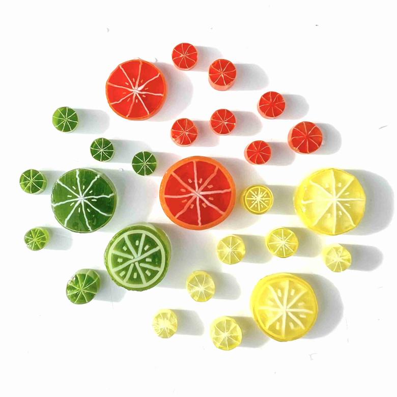 Experience our diverse collection of mixed-size murrine, encompassing mini, normal, large, and XL pieces, altogether expertly pulled to dimensions exceeding typical murrine sizes. Measuring 15mm in length and 9mm in width, these murrine also undergo immediate placement into a second kiln for a rigorous 4-hour annealing process, owing to their considerable thickness, necessitating cutting with a tile saw. Add a zesty pop to your creations with Mixed Size Citruses Murrine—vibrant, juicy slices for a refreshing touch!