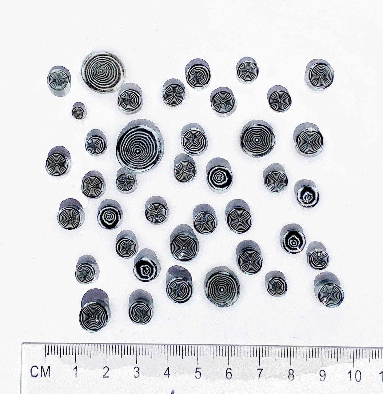 Explore our diverse collection of mixed-size murrine, including mini, regular, large, and XL pieces. Each one exceeds standard murrine sizes, measuring 15mm in length and 9mm in width. Due to their thickness, these pieces undergo a 4-hour annealing process in a second kiln. Afterward, we carefully cut them with a tile saw. Enhance your glass projects with our Liquorice Swirl Mixed Size Murrine. These murrine are perfect for creating striking and eye-catching designs.