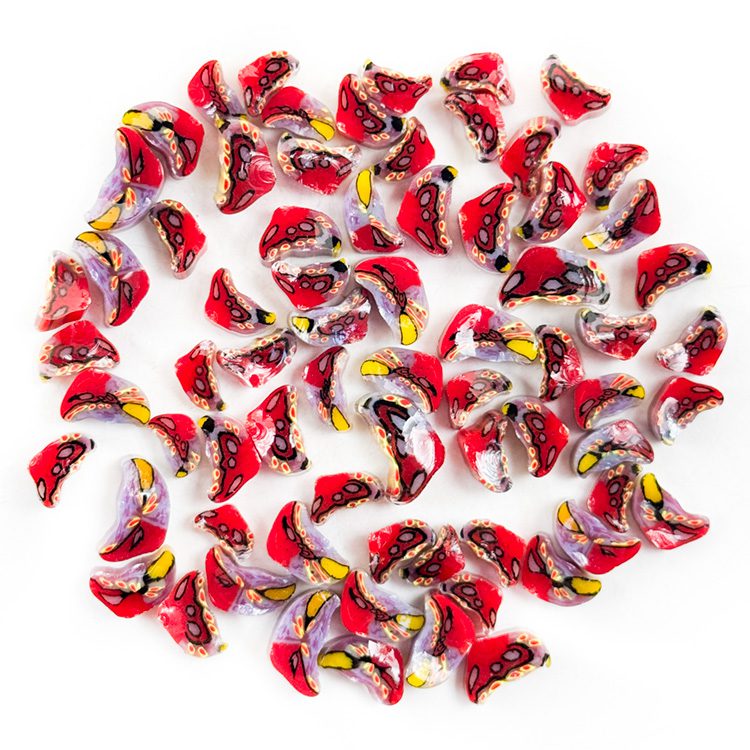 You have options to buy these either as cane pieces or in 2-4mm slices (at an extra charge). We offer weights in Grams – 15g, 25g, 100g, or 200g and Ounces – ½oz, 1oz, 4oz, 8oz bags. Each murrine measures between 4mm-8mm in diameter.
