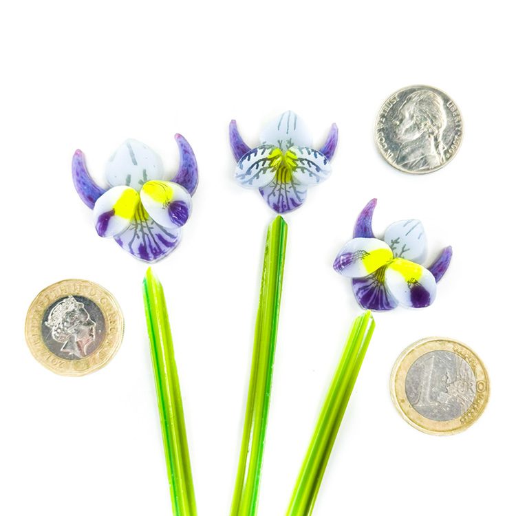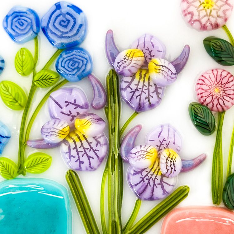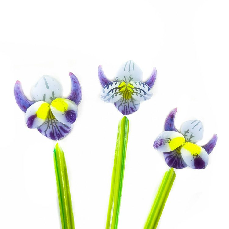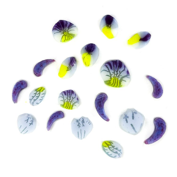 XL Iris murrine – a beautiful addition to your fused glass artwork. Bullseye Glass 90COE. You will receive 3 XL Murrine Iris Flowers.