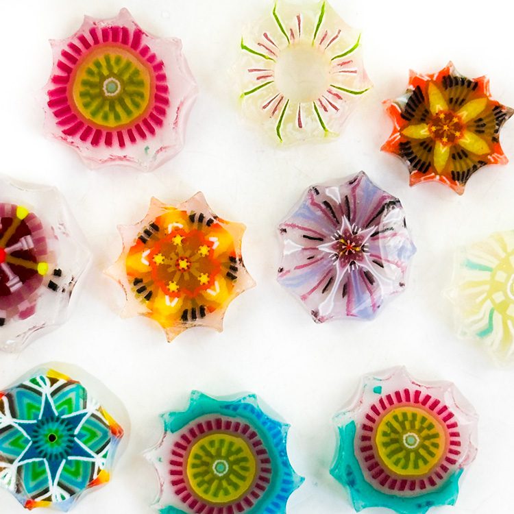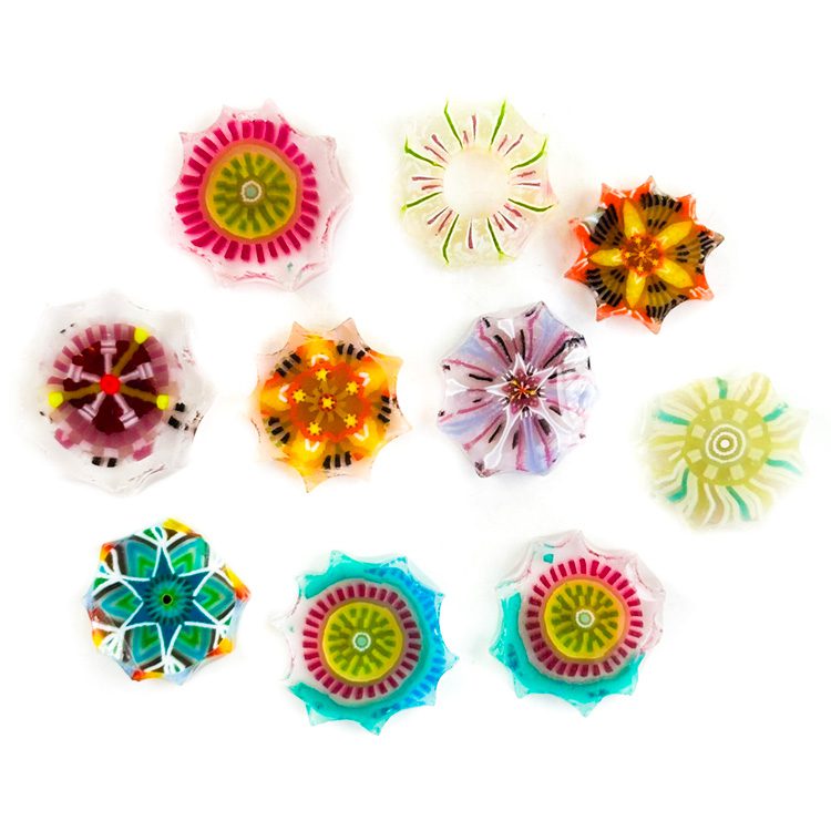 Mandala Mix XL murrine is a great addition to your fused glass artwork. The photograph of the unfired slices shows a 25g sample. The murrine designs you’ll receive will vary. Will include hollows, misshapen and chipped pieces.