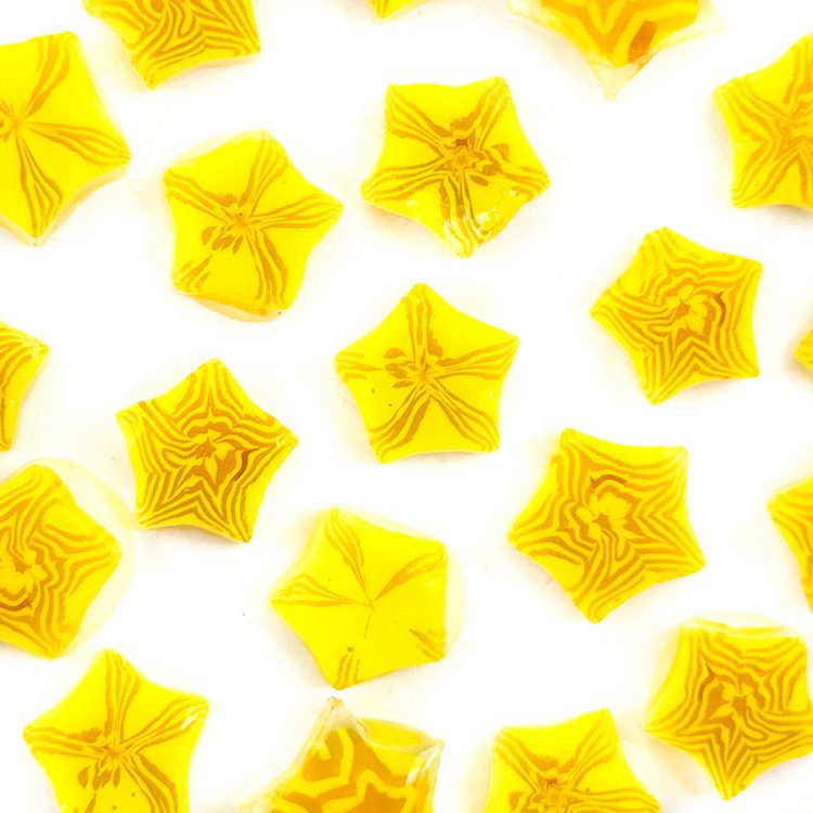 At Tabitha’s Glass Emporium, we proudly offer the most extensive range of vibrant murrine available anywhere in the world. Add a pop of color and charm to your projects with the vibrant Rippled Star , perfect for any artistic creation!