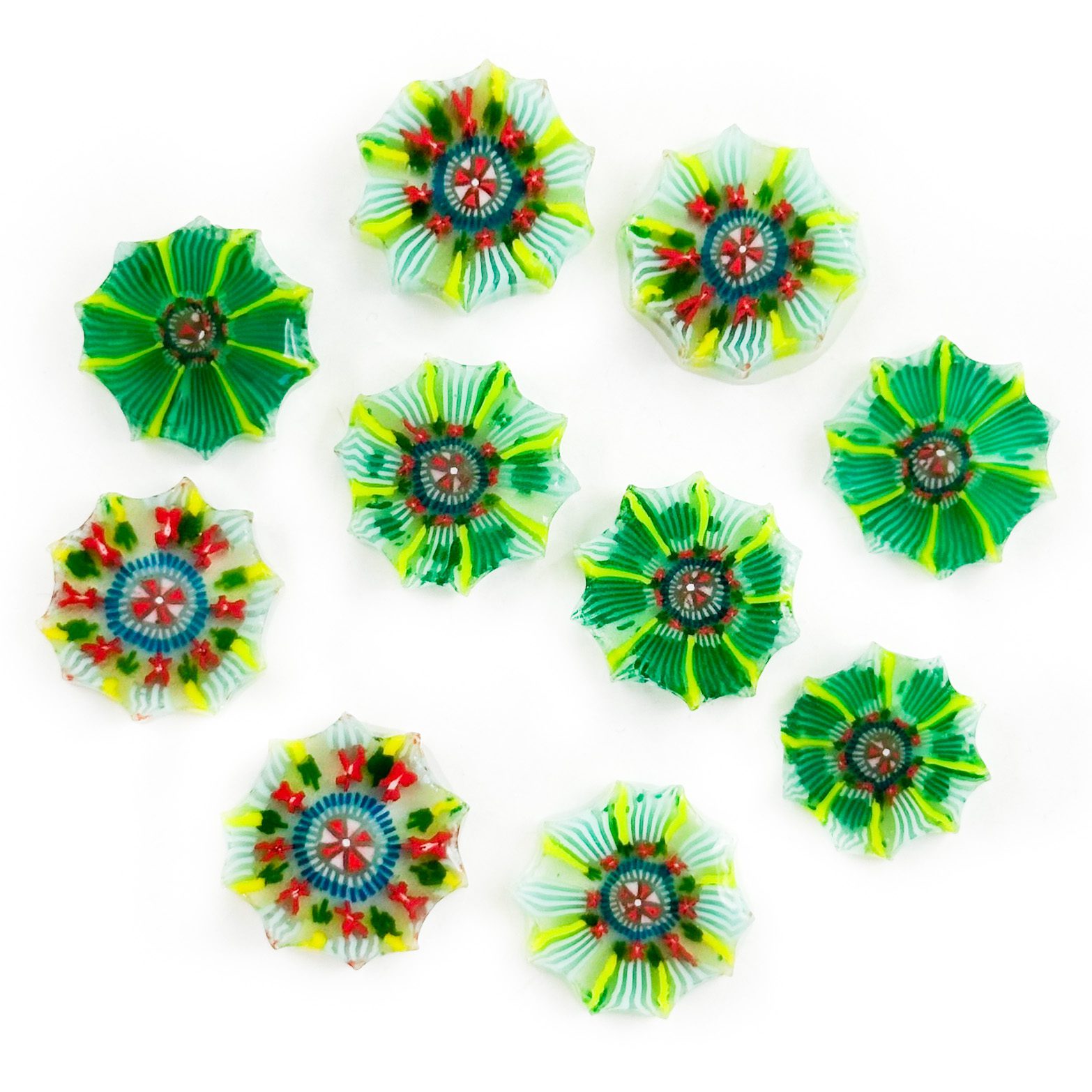 These murrine stand out, ranging from 10mm to 18mm in diameter. Once pulled from the Vitrigraph kiln, they enter another kiln for the crucial annealing process.