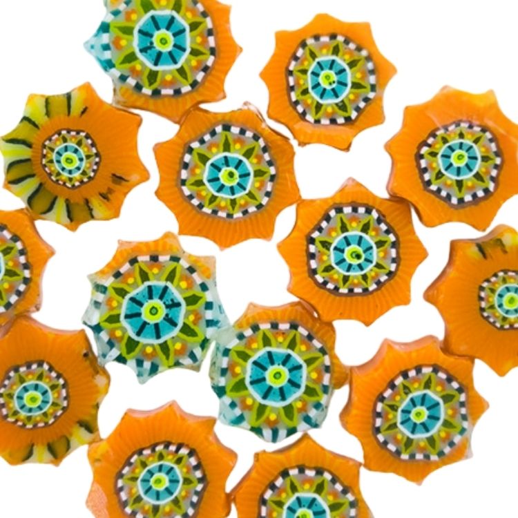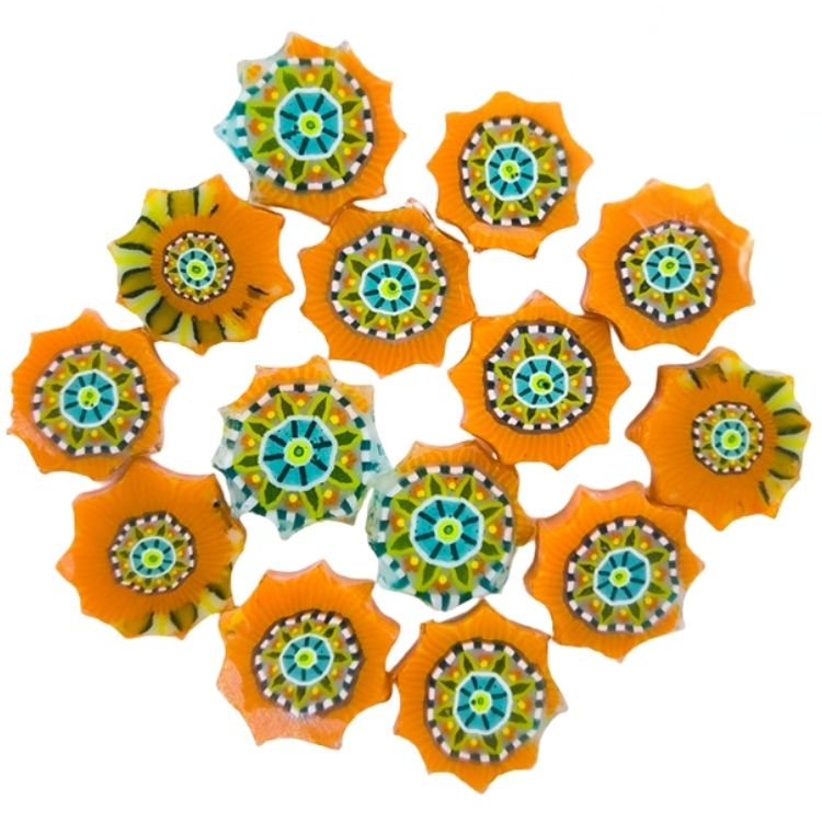 Tabitha’s Glass Emporium proudly creates and produces XL Murrine, which exceed 10mm / 1/2 inch in diameter. Elevate your designs with XL Tribal Mandala Murrine—add a radiant, intricate touch that captures warmth and beauty in every piece!